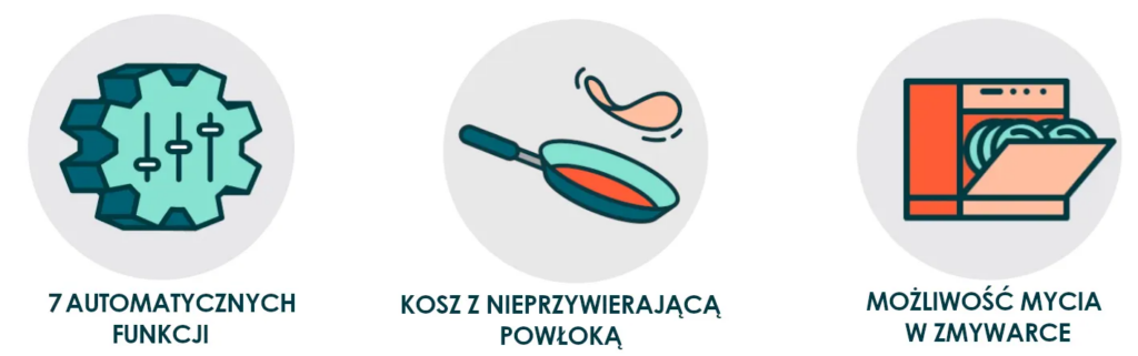 w użyciu. Może posłużyć nie tylko do przygotowania frytek czy chrupiących skrzydełek z kurczaka, ale także do pieczenia, opiekania, podgrzewania lub suszenia rożnego rodzaju potraw.