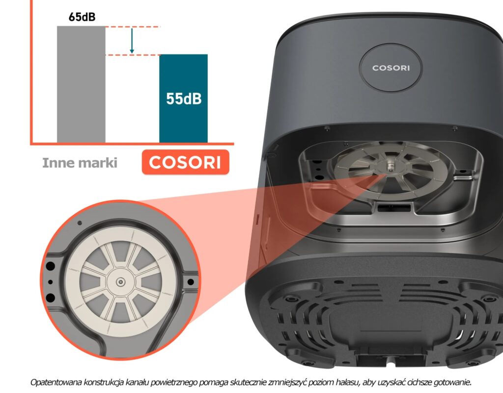 Zastosowanie zupełnie nowej konstrukcji kanału powietrznego w tej frytownicy umożliwiło obniżenie poziomu hałasu do maksymalnie 55 dB podczas pracy. Teraz, gdy rozpoczynasz rozmowę, urządzenie nie będzie Ci przeszkadzać.