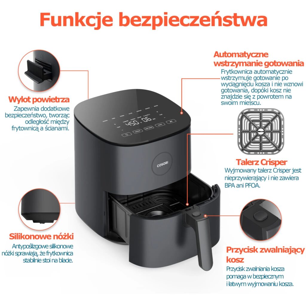 Beztłuszczowa frytkownica Cosori Pro LE 4,7L zapewnia szereg funkcji i rozwiązań, które dbają o bezpieczeństwo użytkownika. Niezależnie od tego, czy korzystasz z niej w domu, czy na przyjęciach, możesz mieć pewność, że urządzenie zostało zaprojektowane z myślą o Twoim bezpieczeństwie. Pamiętaj jednak zawsze o przestrzeganiu instrukcji obsługi i zachowaniu ostrożności podczas użytkowania.