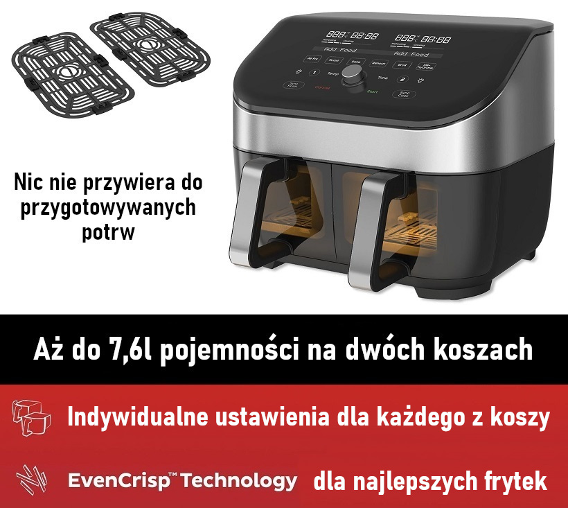Są to funkcje, które pozwalają na jeszcze łatwiejsze i bardziej precyzyjne gotowanie w frytkownicy beztłuszczowej Instant Vortex Plus Dual.