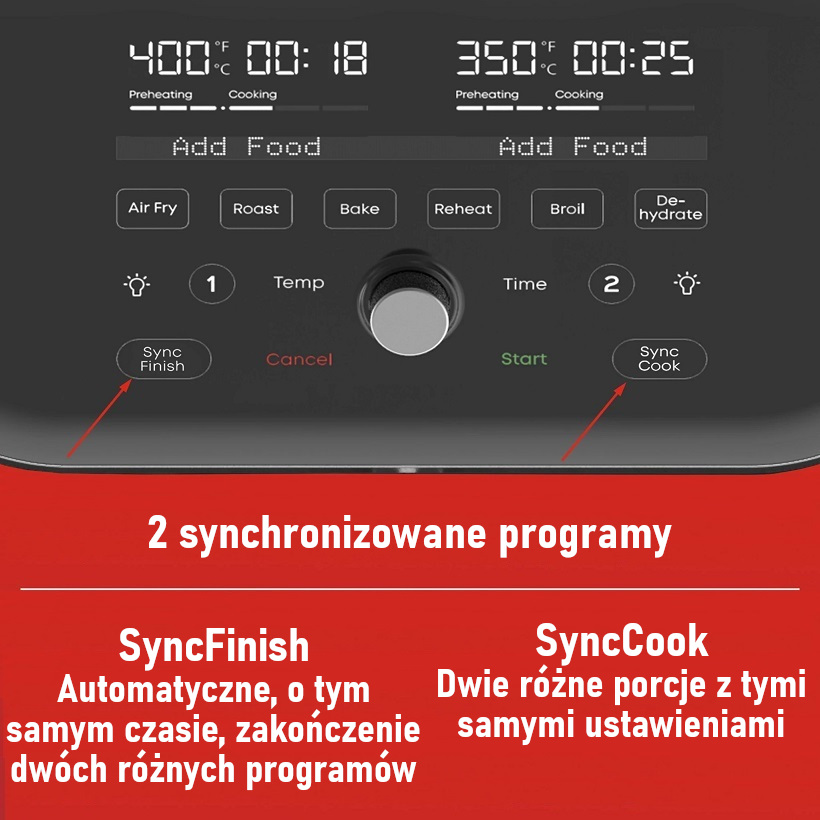 Funkcja SyncCook umożliwia jednoczesne gotowanie różnych potraw, ale z różnymi czasami przygotowania, na różnych poziomach koszyków wewnątrz urządzenia. Dzięki temu możesz jednocześnie przygotowywać mięso, warzywa czy owoce morza, a następnie dostosować czas gotowania każdej z tych potraw do ich indywidualnych potrzeb, bez konieczności korzystania z osobnych programów gotowania. Funkcja ta pozwala na oszczędność czasu i na równoczesne przygotowanie różnorodnych potraw.