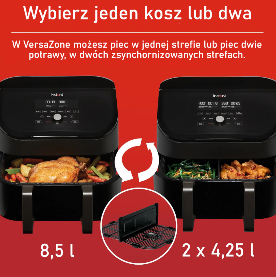 Frytkownica beztłuszczowa Instant Vortex VersaZone posiada funkcję podwójnego gotowania, co oznacza, że można w niej przygotować dwie różne potrawy jednocześnie. Urządzenie wyposażone jest w dwa kosze na jedzenie oraz dwa oddzielne wentylatory, co pozwala na równomierne i skuteczne gotowanie dwóch różnych potraw bez potrzeby ich mieszania.