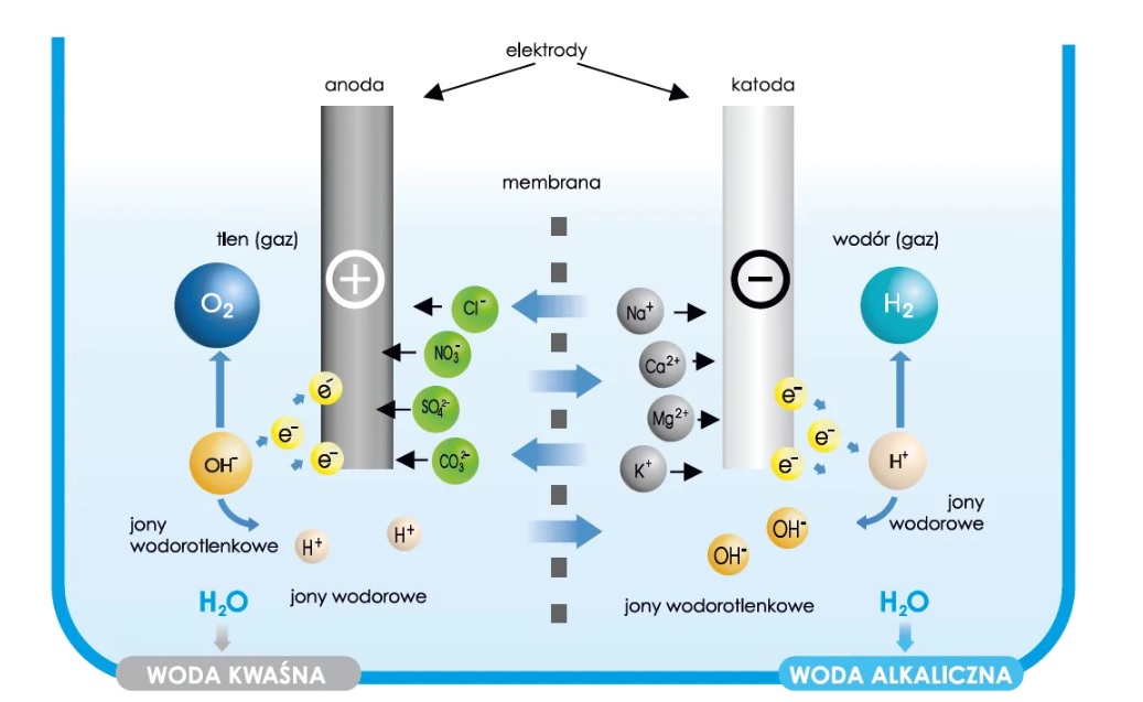 Urządzenie posiada dodatnią anodę i ujemną katodę. Podczas procesu elektrolizy następuje dysocjacja, czyli trwałe rozłączenie substancji o właściwościach zasadowych i kwasowych w wyniku czego powstają dwa rodzaje wody: alkaliczna (zasadowa) i kwasowa.