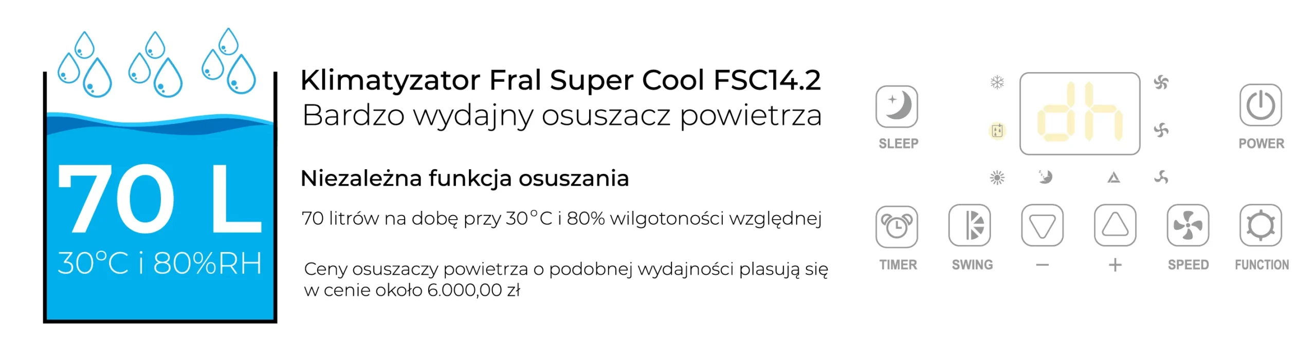 Jako jeden z nielicznych klimatyzatorów na rynku, FRAL Super Cool FSC14.2 Black jest pełnoprawnym osuszaczem, który może oddzielić aż 70 litrów wody na dobę bez konieczności chłodzenia pomieszczenia.