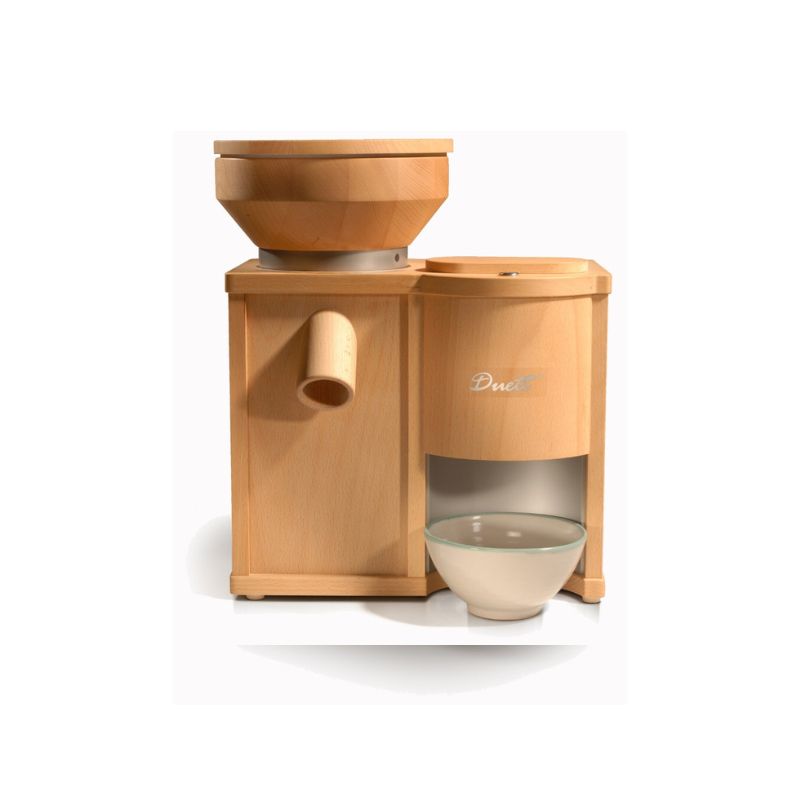 Obudowa z bukowej sklejki, misa zasypowa i pokrywa – lite drewno bukowe. Żarna korundowo-ceramiczne, wałki stożkowe ze stali nierdzewnej