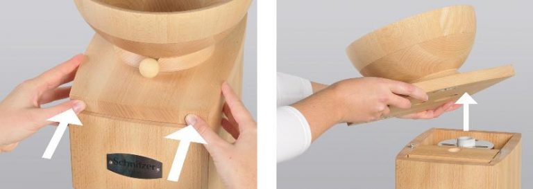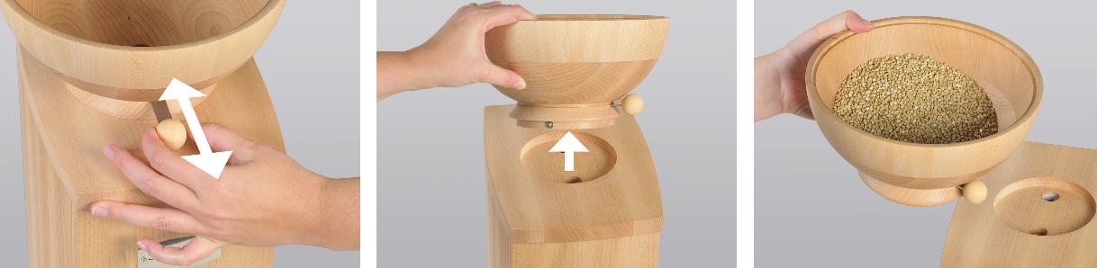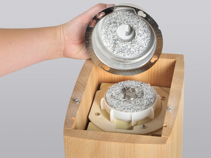 Młynek Vario został wyposażony w łatwy dostęp do kamieni mielących.  W tym celu należy zdjąć pokrywę młynka poprzez przesunięcie jej lekko ruchem posuwistym od siebie, aż do momentu wyczucia oporu. W kolejnym kroku pokrywę należy podnieść do góry. Pełen dostęp do kamieni mielacych jest możliwy po wyjęciu drewnianego zsypu wewnętrznego.