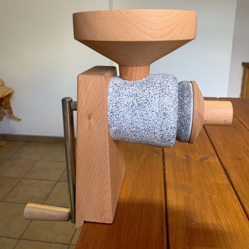Atrakcyjna obudowa oraz misa zsypowa z drewna bukowego nasączonego olejem lnianym, kamienie młyńskie wykonane z korundu oraz wspornik stołu i korba z litej stali to główne zalety młynka.