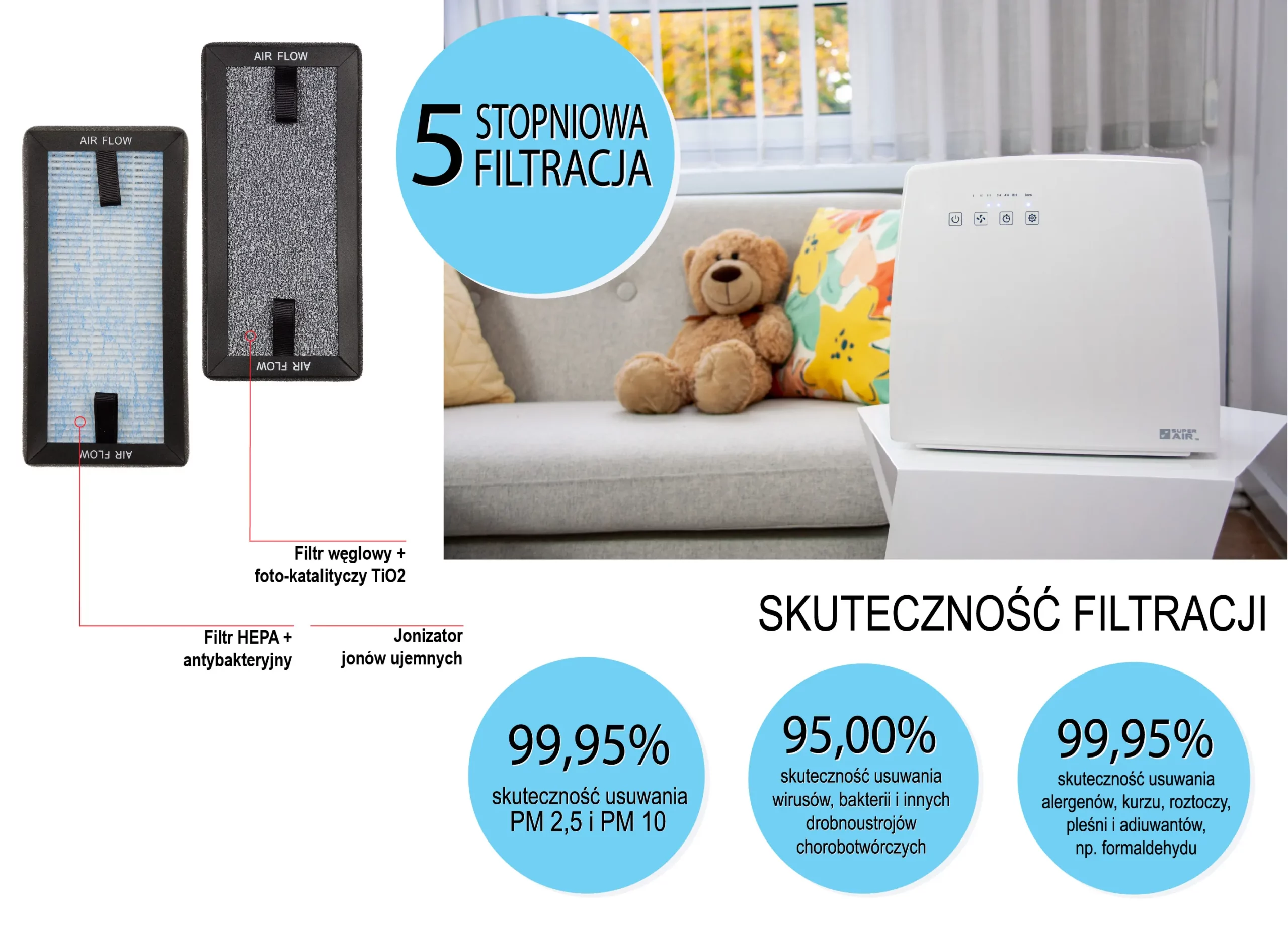 Oczyszczacz powietrza usuwa aż 99,95% zanieczyszczeń pyłowych PM2.5 i PM10.
