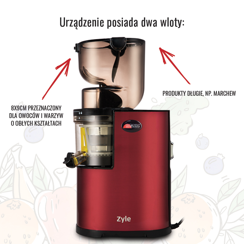 Jeden wlot przystosowany jest do długich produktów jak na przykład marchew czy seler naciowy, drugi posiada średnicę 8 × 9 cm i przeznaczony jest dla owoców oraz warzyw o okrągłych kształtach. Otwór ten z łatwością pomieści takie produkty jak całe jabłko czy burak.