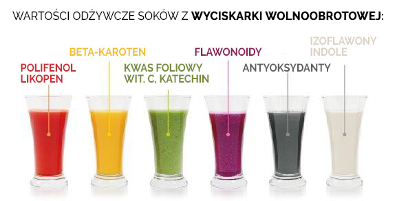 - Sok z wyciskarki ma więcej składników odżywczych i zaspokaja głód na dietach, ponieważ zawiera delikatny miąższ.